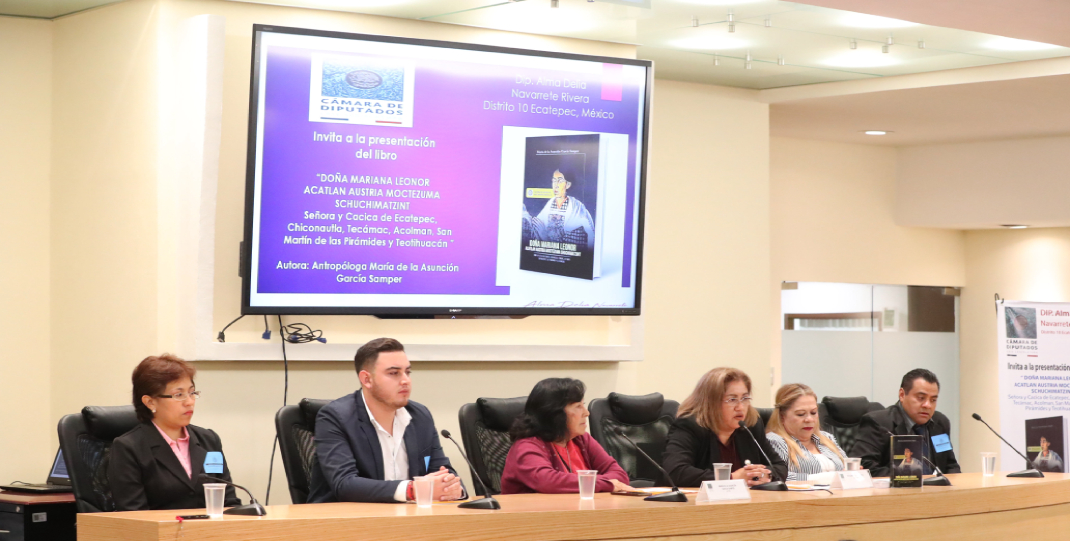 Para difundir la participación de la mujer prehispánica y reivindicar su contribución en la política y economía, se presentó el libro “Doña Mariana Leonor Acatlán Austria Moctezuma Schuchimatzint. Señora y cacica de Ecatepec, Chiconautla, Tecámac, Acolman, San Martín de las Pirámides y Teotihuacán”.